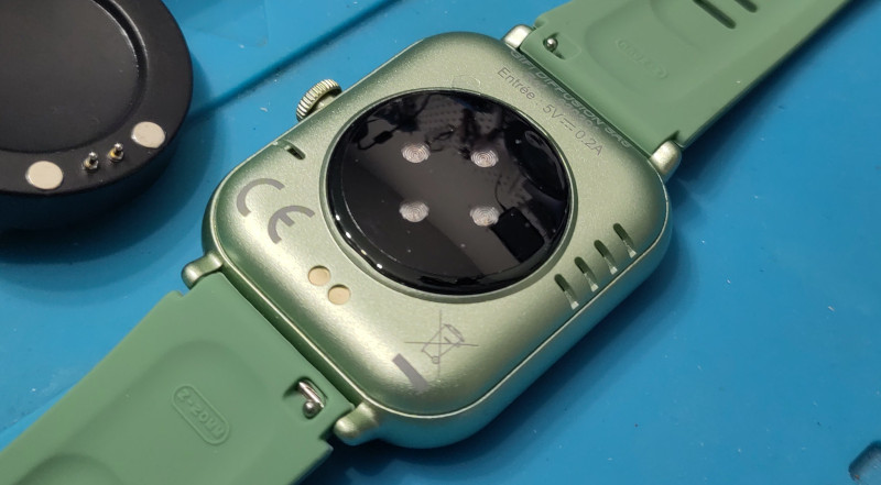 Un aspect de la montre m'a tout de même intrigué. Comme l'expliquait Stéphane Marty dans son excellente vidéo intitulée Montre connectée intelligente à 2€ : anatomie d'une arnaque Aliexpress, les capteurs permettant de mesurer la saturation en oxygène dans le sang, ainsi que ceux mesurant le rythme cardiaque par exemple sont relativement coûteux et sont composés de plusieurs éléments miniaturisés dont des récepteurs photosensibles qui doivent être visibles sous le boîtier.