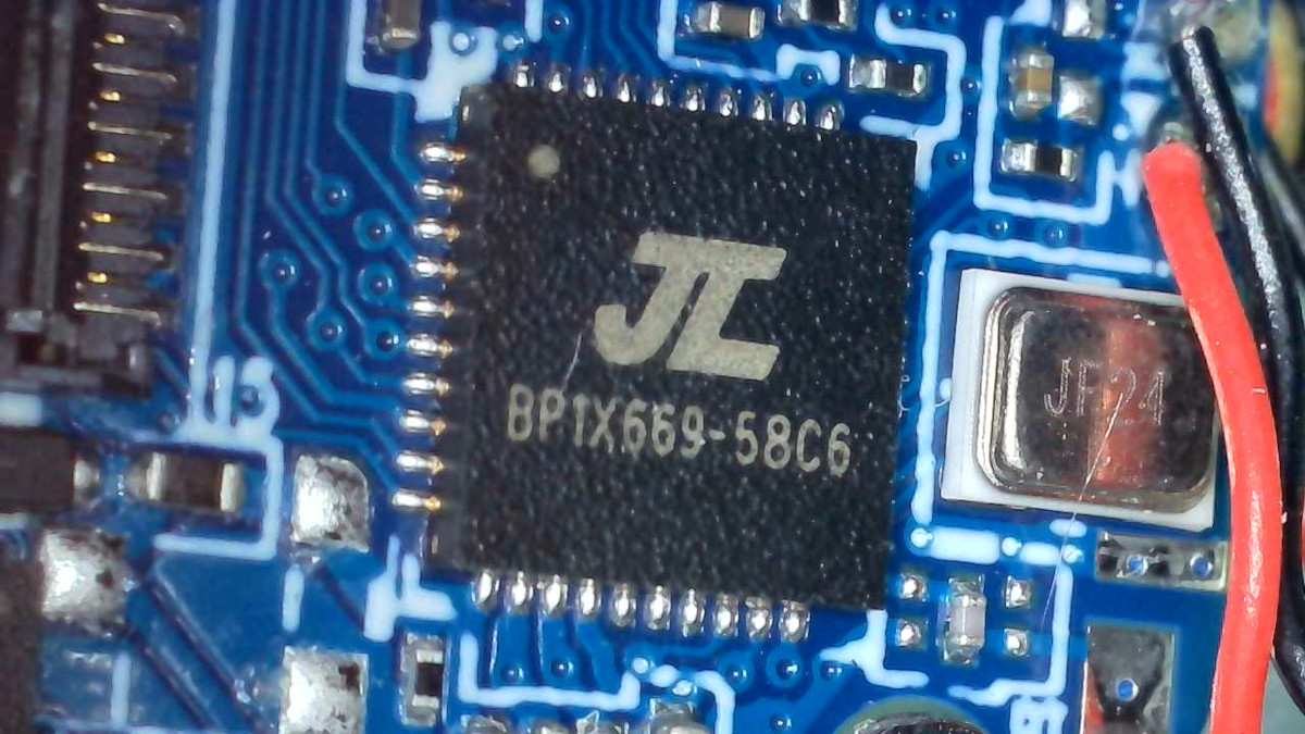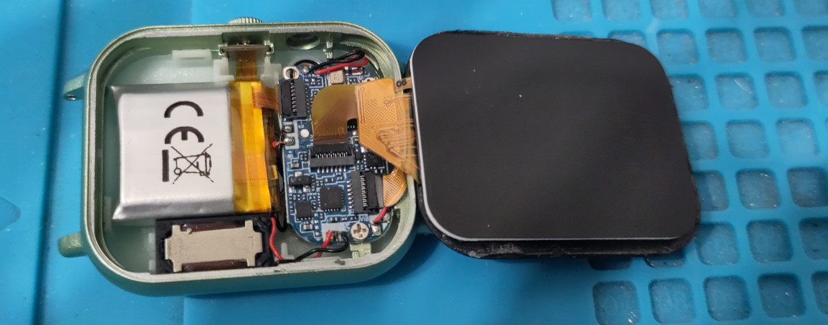 Je réussis ensuite à retirer l'écran et découvrir l'intérieur de la montre, et à ce moment la supercherie ne tient plus. La montre possède une petite batterie (annoncée à 200mAh) reliée à un petit circuit imprimé, auquel est aussi connecté un écran avec dalle tactile, un vibreur, un haut-parleur et un microphone. Pas de trace de capteur, juste ce qui ressemble à un système-sur-puce JieLi AC6958C6 en charge de la gestion de l'écran, de l'audio, de la connectivité Bluetooth, ainsi que des entrées utilisateurs.